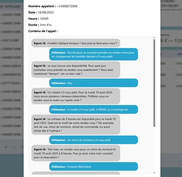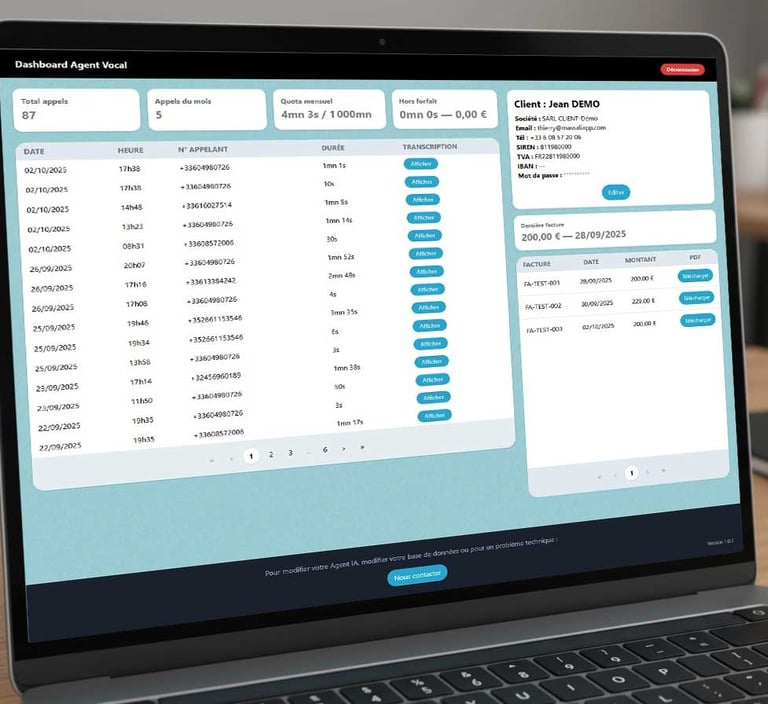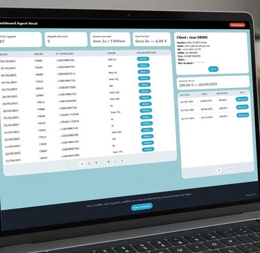 Le Dashboard Client IA est une interface simple et intuitive permettant à chaque entreprise ou commerce de suivre en temps réel l’activité de ses agents vocaux ou chatbots.