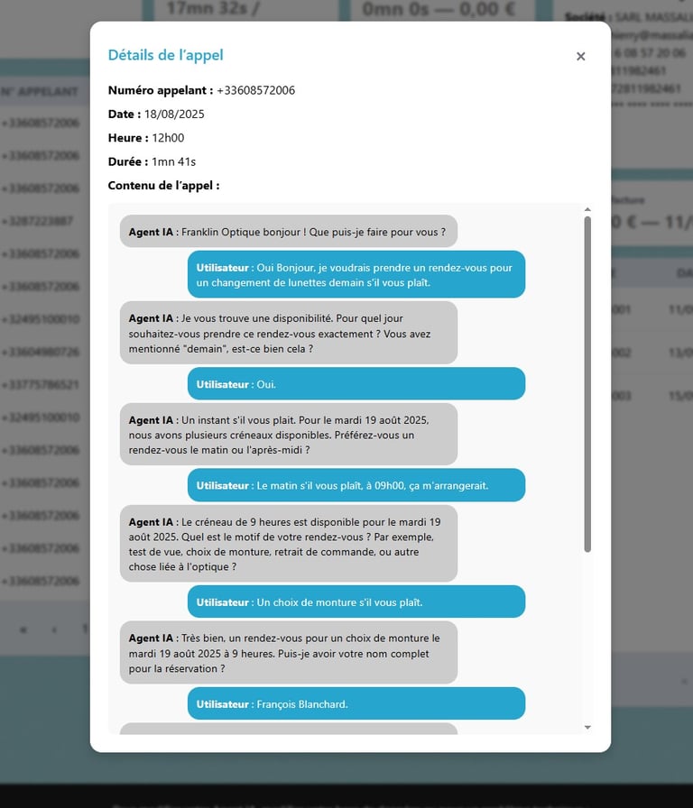 Connecté à votre Dashboard Massaliapp, il envoie automatiquement les transcriptions et statistiques d’appels.